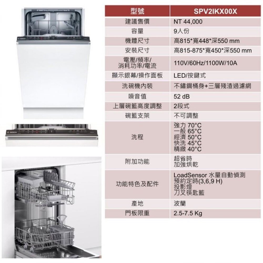 BOSCH 博世牌 SPV2IKX00X 全嵌式 洗碗機 45 cm