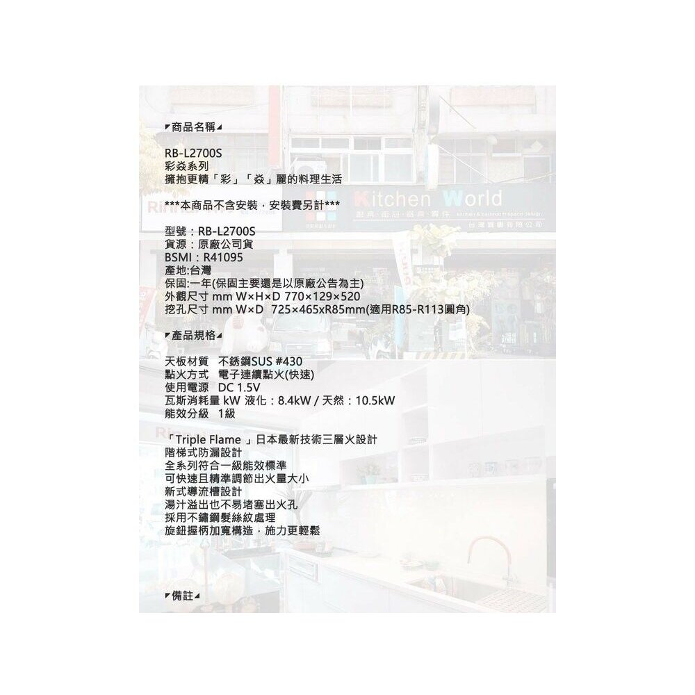 林內牌 彩焱系列 RB-L2700S 林內檯面式不銹鋼雙口爐 瓦斯爐