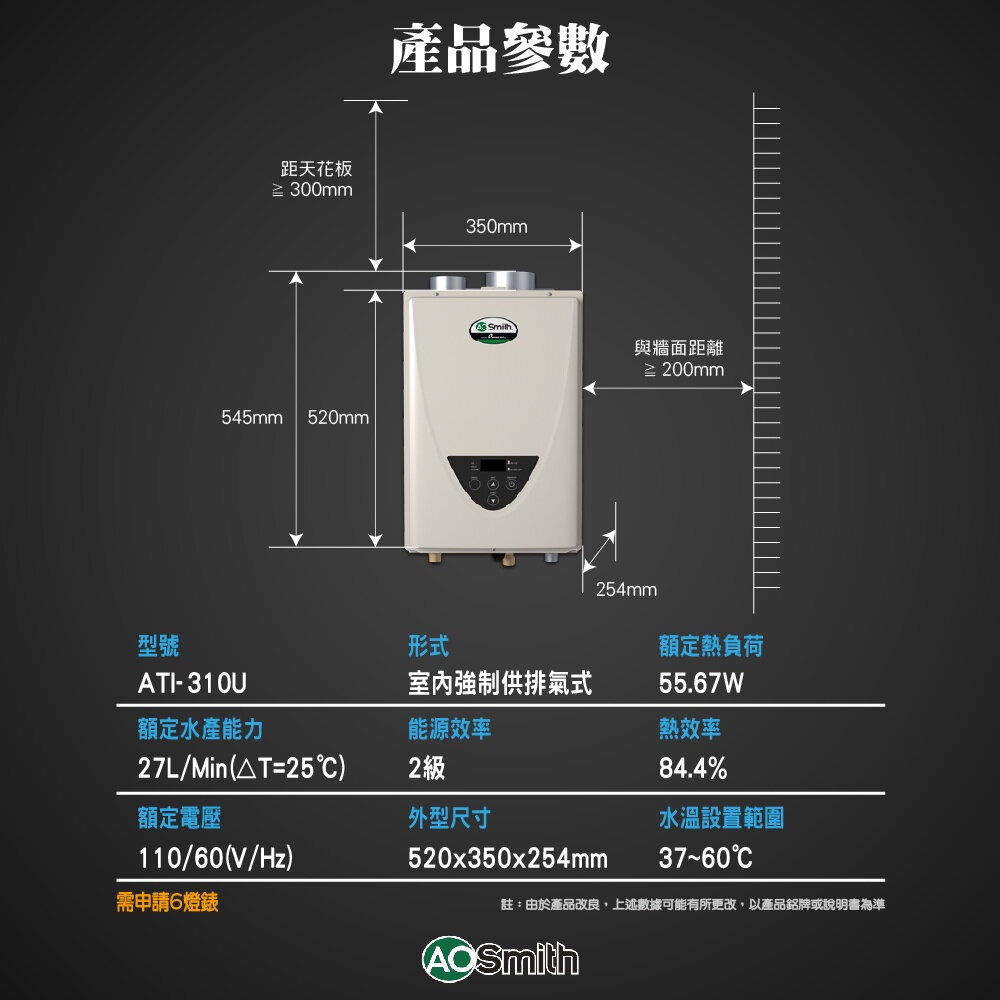 型號: ATI-310U 27L 瓦斯熱水器 室內型強制排氣 防一氣化碳 美國原裝進口