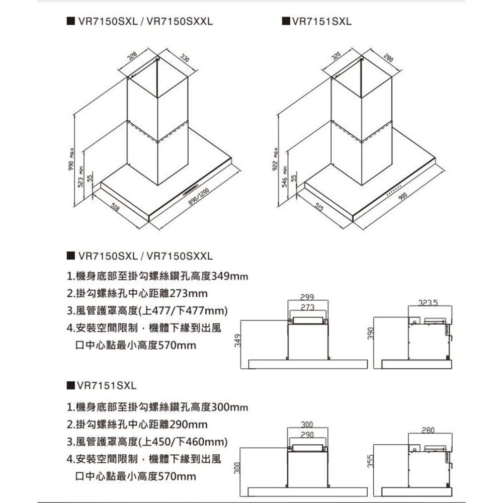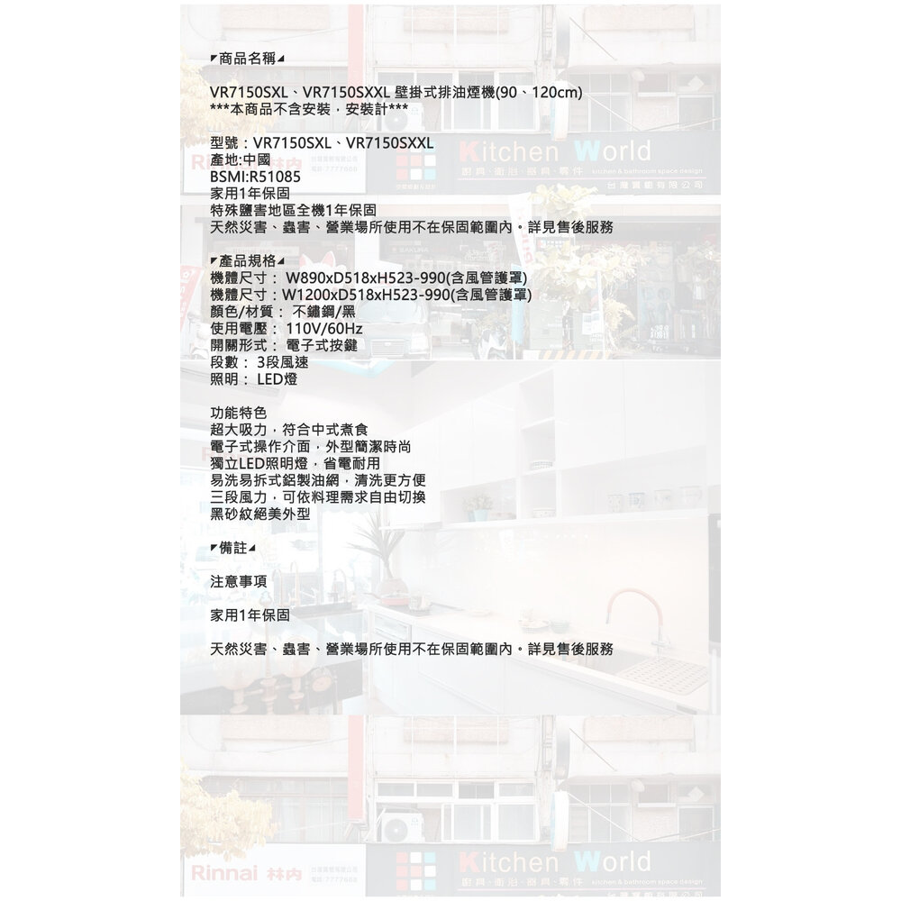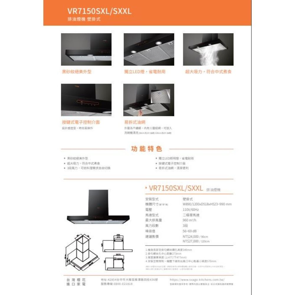 型號:VR7150SXL VR7150SXXL壁掛式排油煙機90、120cm排油煙機
