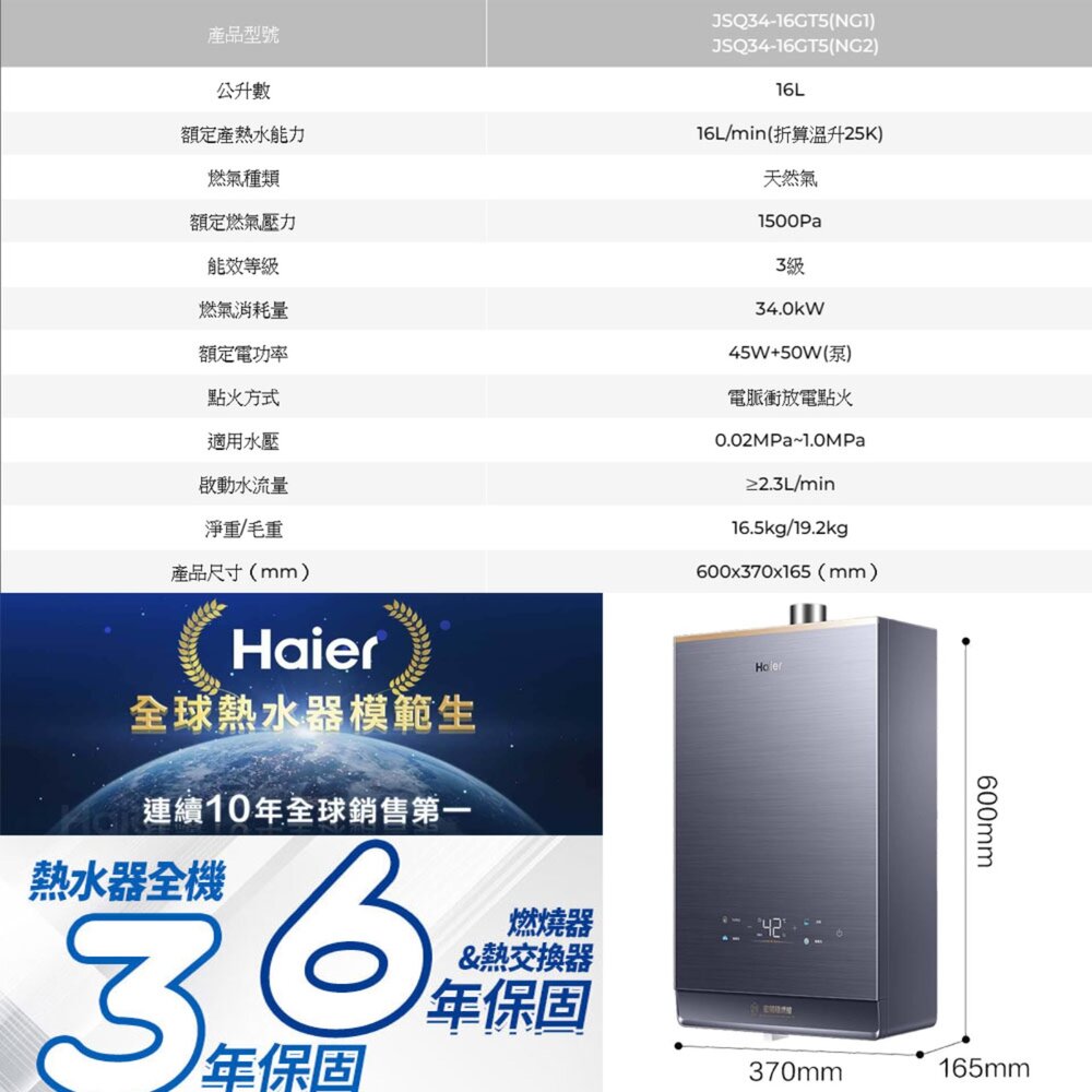 Haier 海爾 GT5-16L 燃氣熱水器 16L GT5數位恆溫2.0