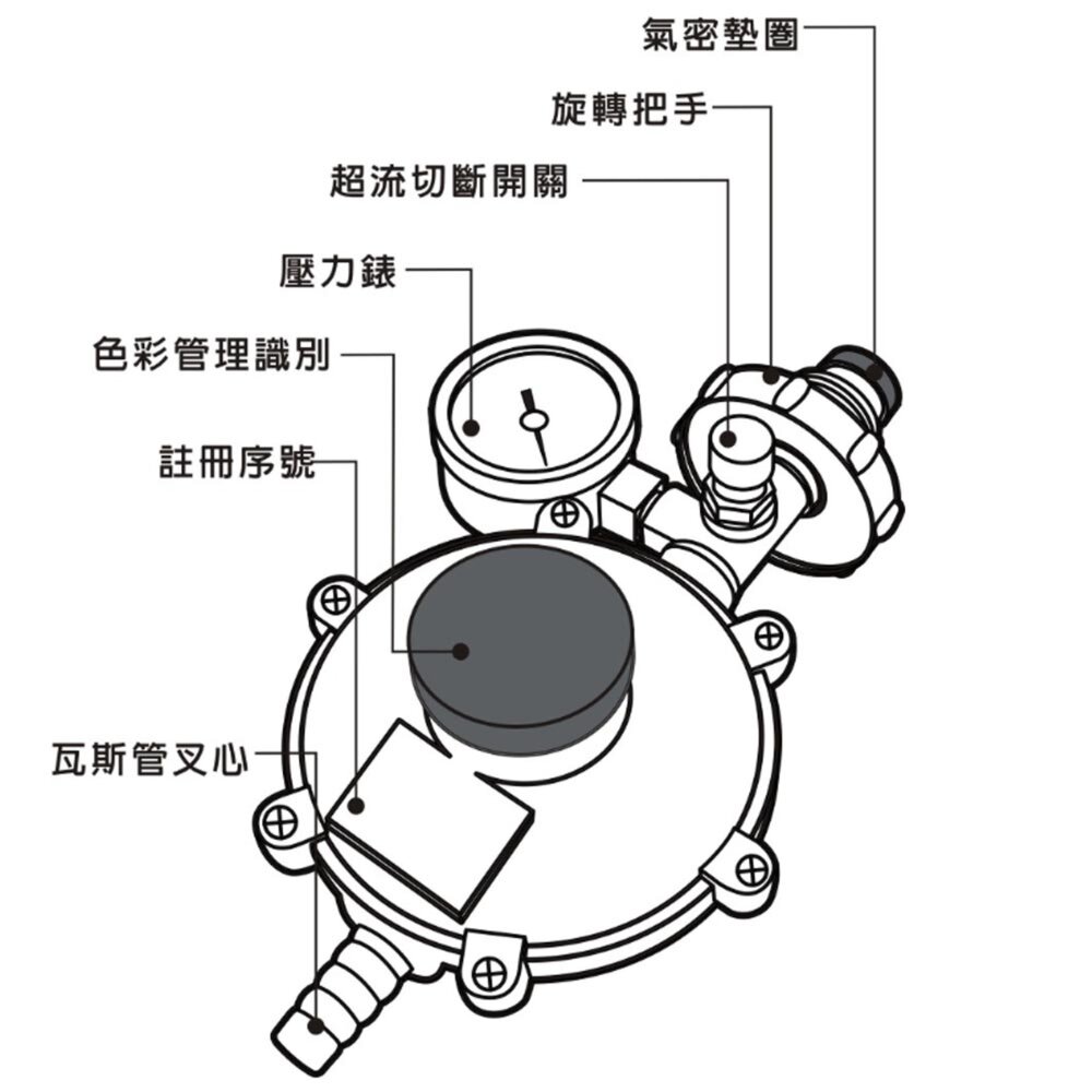 用途:適用於以液化石油氣作為烹調、熱水供應之燃料,主要供一般家庭用的壓力調整器。