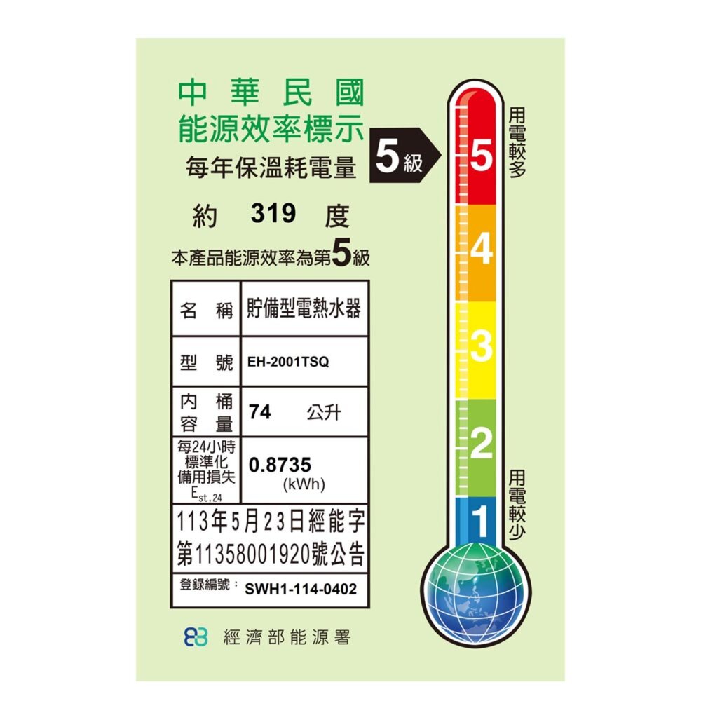 HMK鴻茂 EH-2001TSQ 74L 橫掛式調溫型 電熱水器